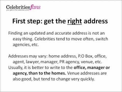 How to Contact A Celebrity? - Celebrity Address Database - Write to your favorite celebrities and get them to answer. The full eBook is here: http://bit.ly/fKUheh Brought to you by CelebritiesFans, the leading online ...